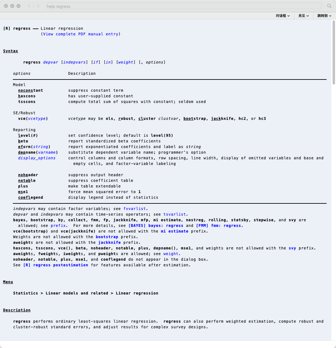 其中下面这一块,表示命令格式,其中 regress 表示变量名(可简写为 reg),depvar 为因变量,indepvars 为自变量,if 为条件,in 为样本范围,weight 为权值,options 为选项。这表明改命令至少需要一个因变量,因为 depvar 并没有用[ ]报告起来,这就说明,该变量必须要要一个变量,否则就会报错。