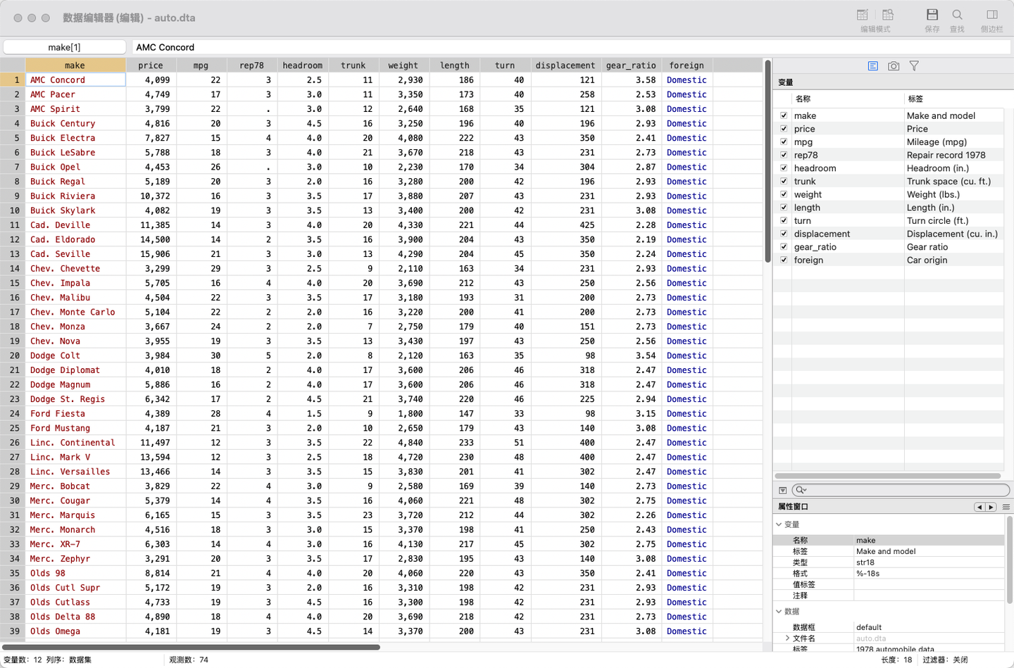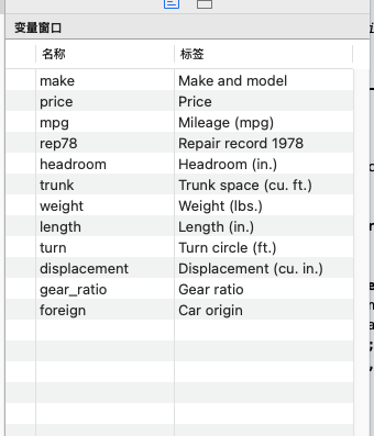 以 auto 数据库为例,其中 make 变量就是字符串格式,foreign 是编码格式,虽然使用字符串显示的,但实际是分类变量,即数值,通过上面也可以看到,foreign 所对应的 type 为 byte而非 str。
